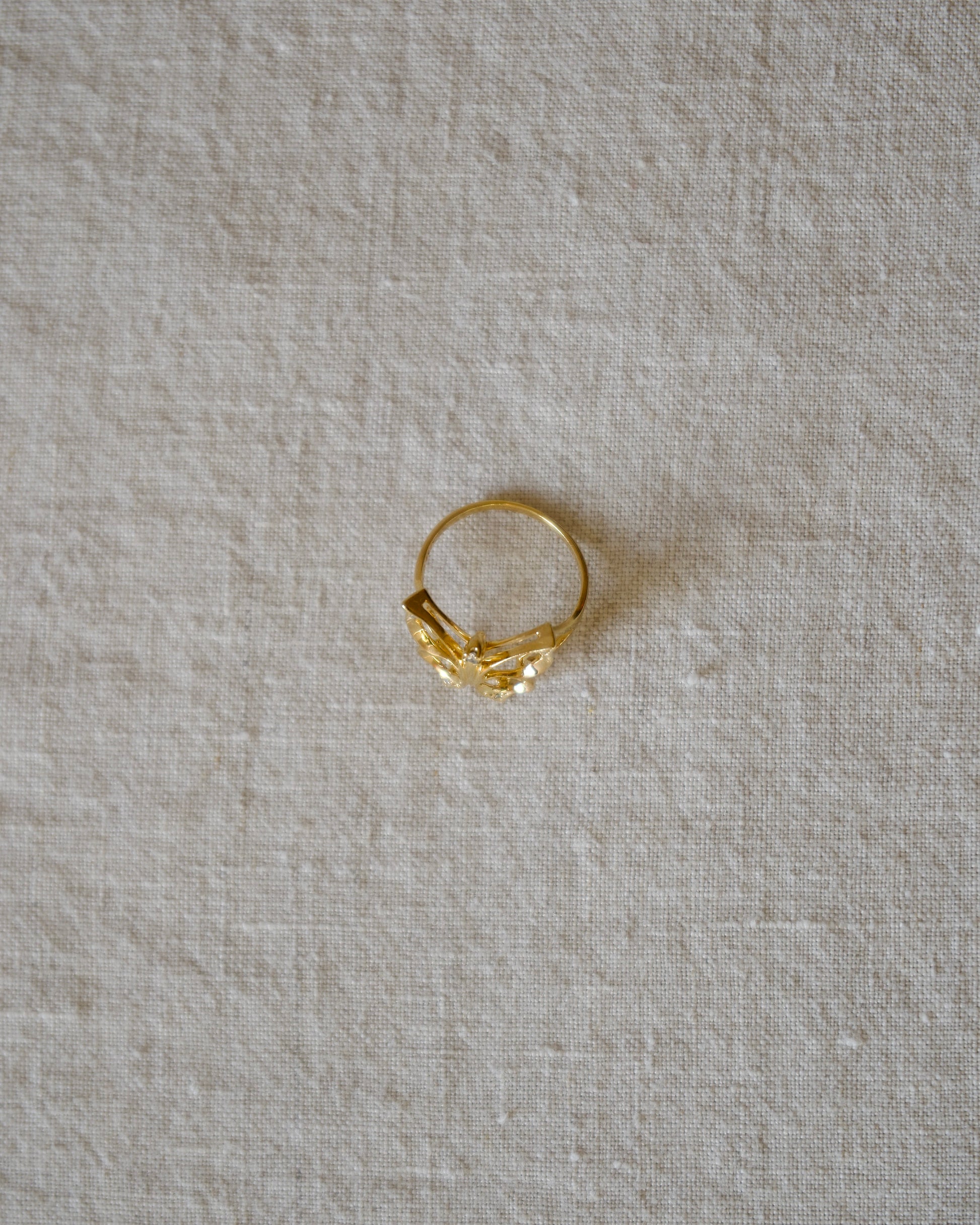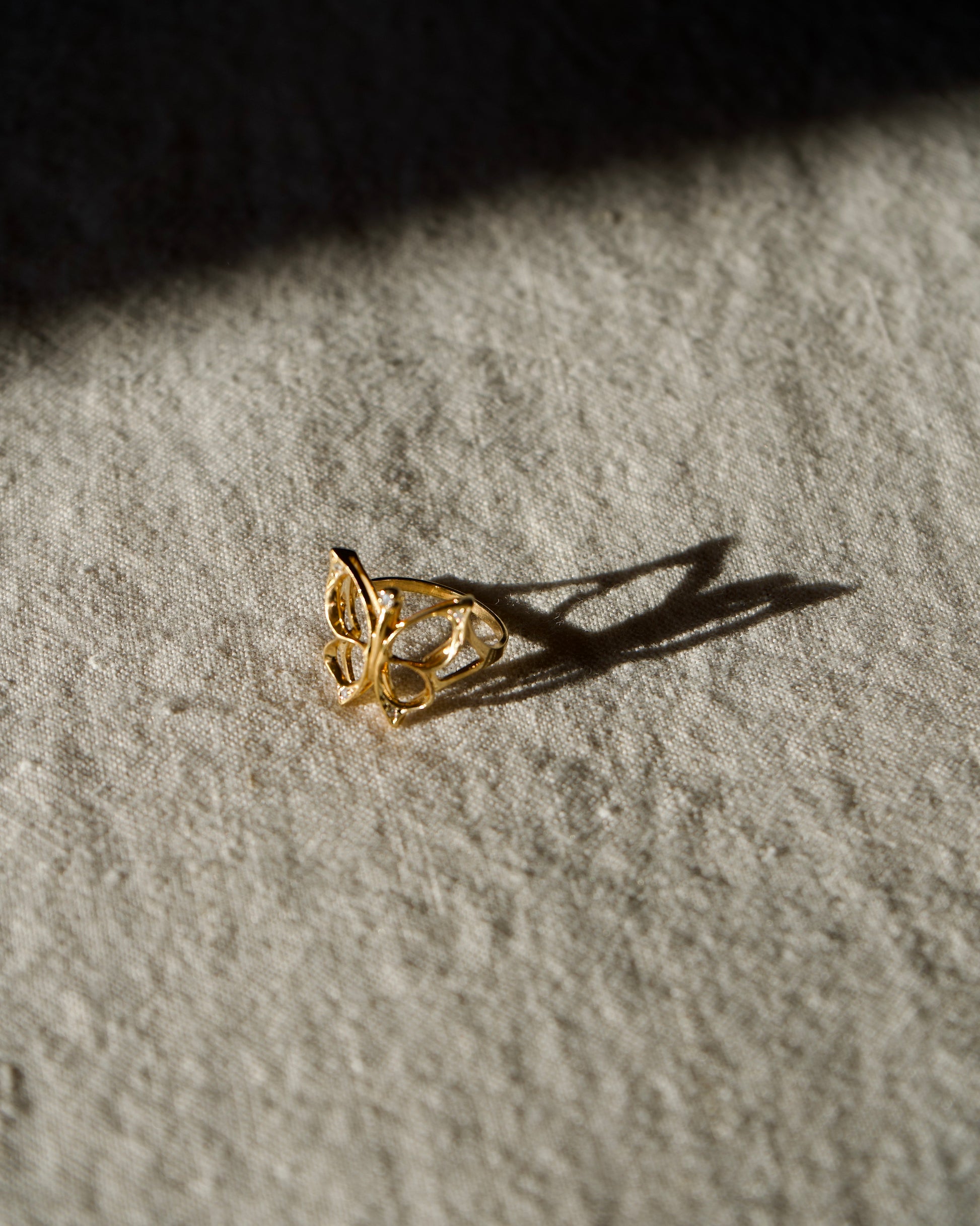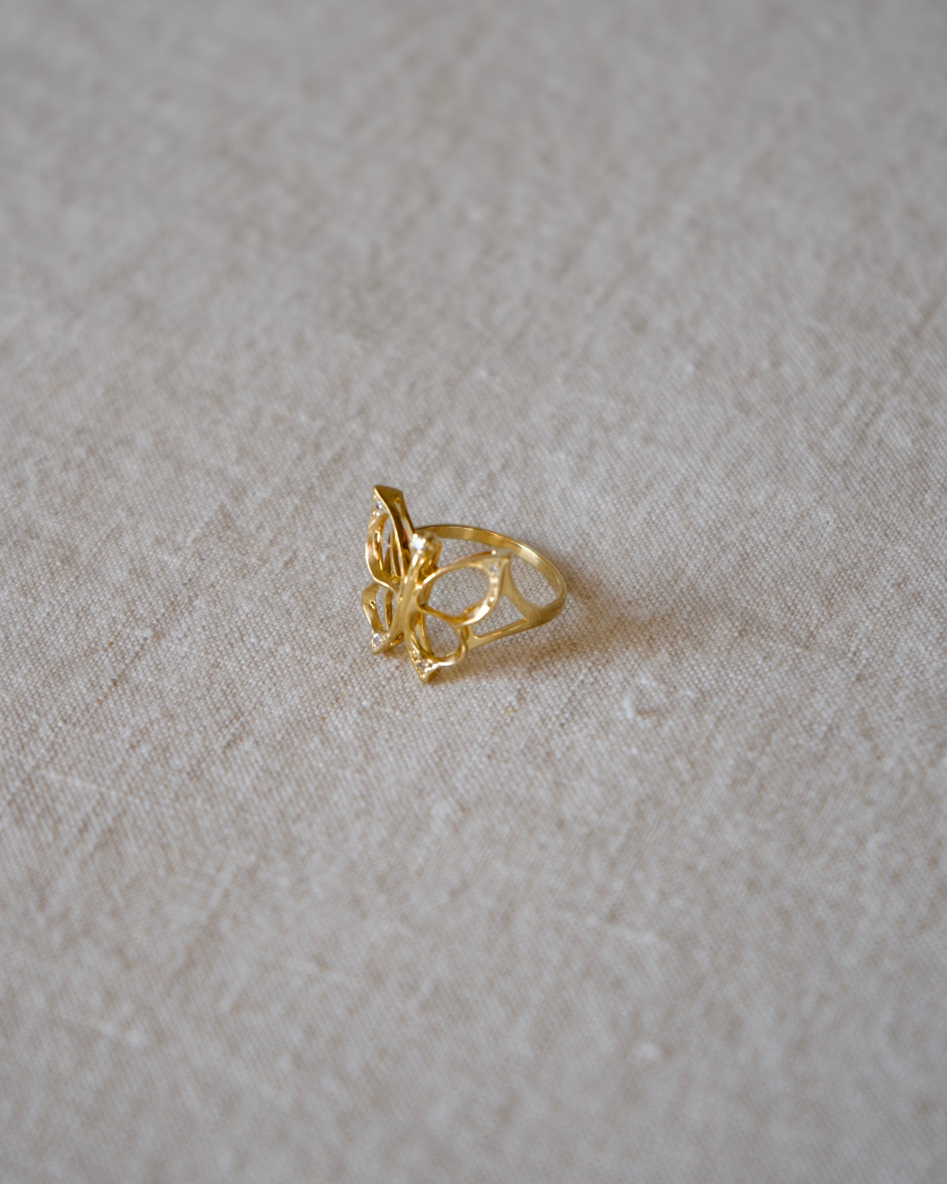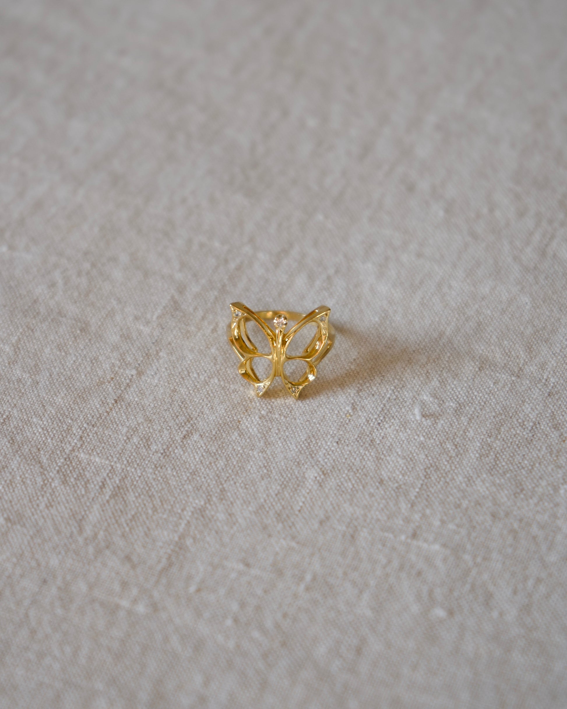 10k butterfly ring featuring five round brilliant cut diamonds.