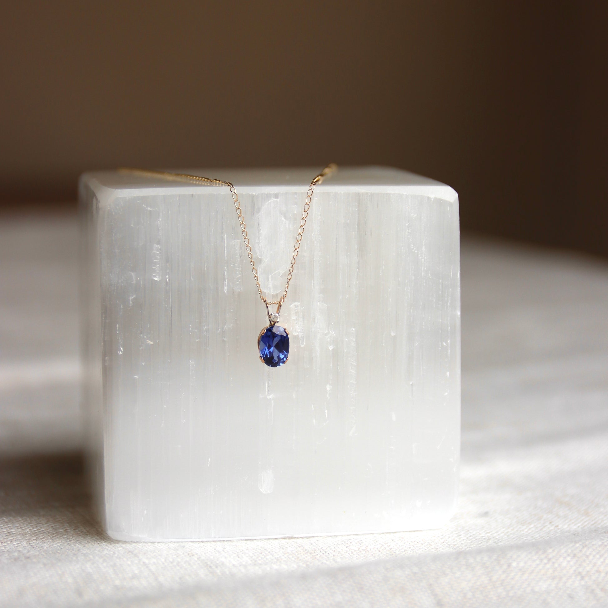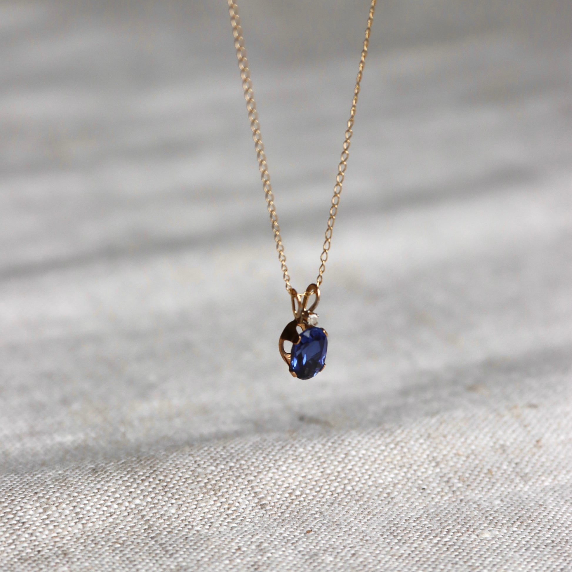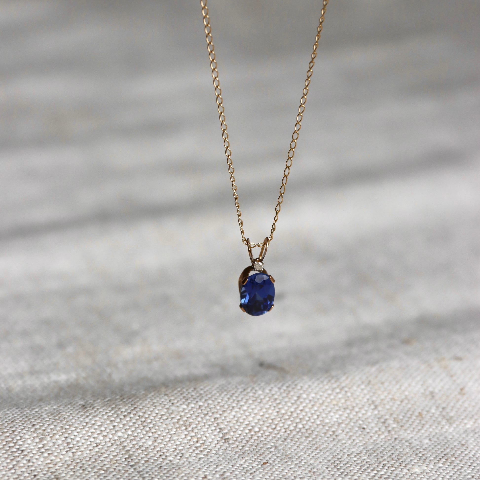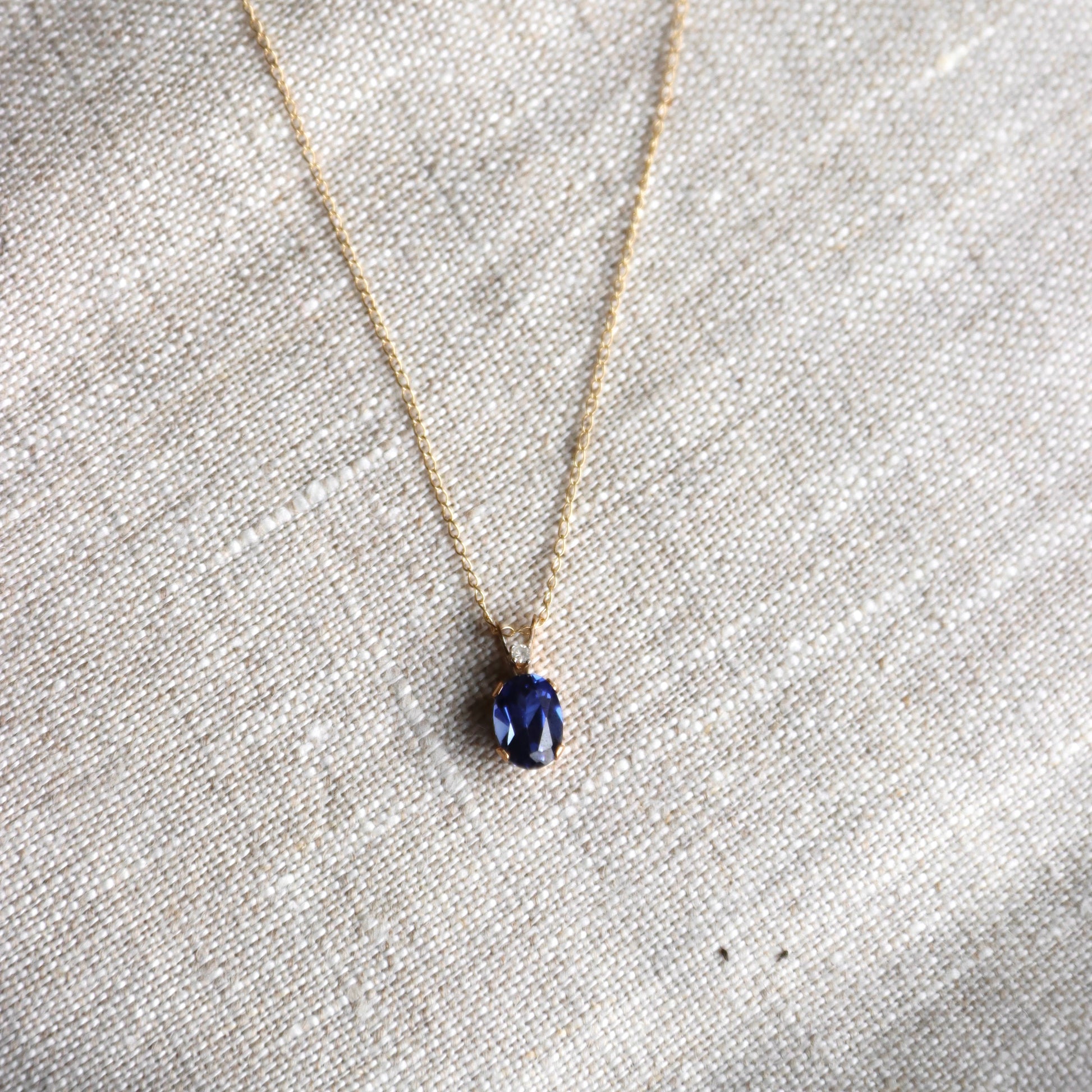 Oval faceted sapphire and diamond necklace with spring ring clasp.