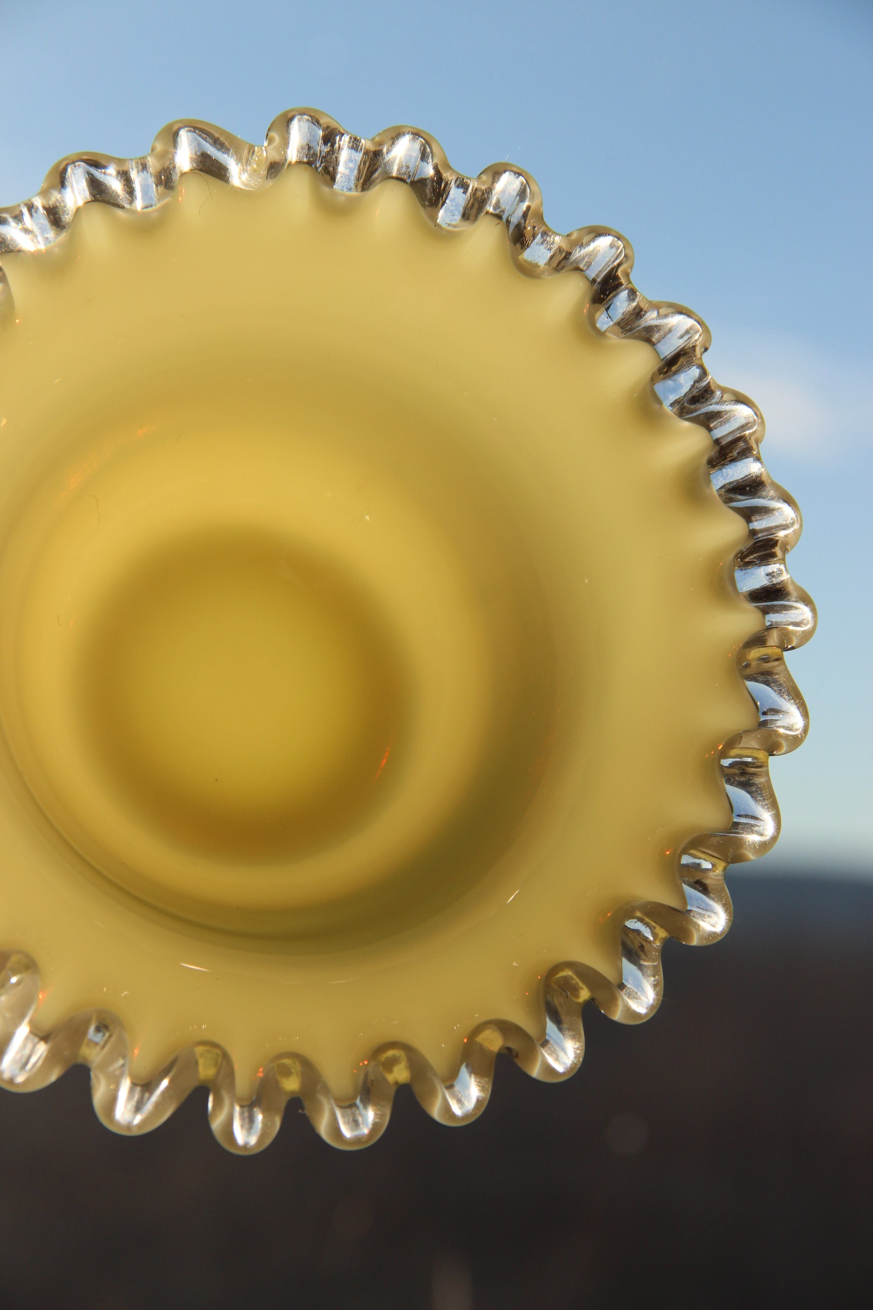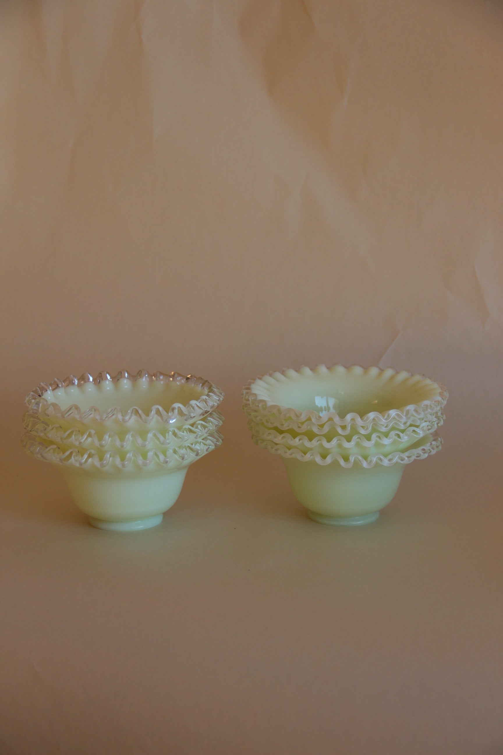 Set of yellow milk glass plates and bowls with clear glass ruffled edge in the "Silver Crest" pattern from Fenton. 8 plates and 7 bowls. The bowl measures 4 3/4" across the rim, 2 1/4" across the base, and 2 3/4" high. In perfect condition with no flaws.