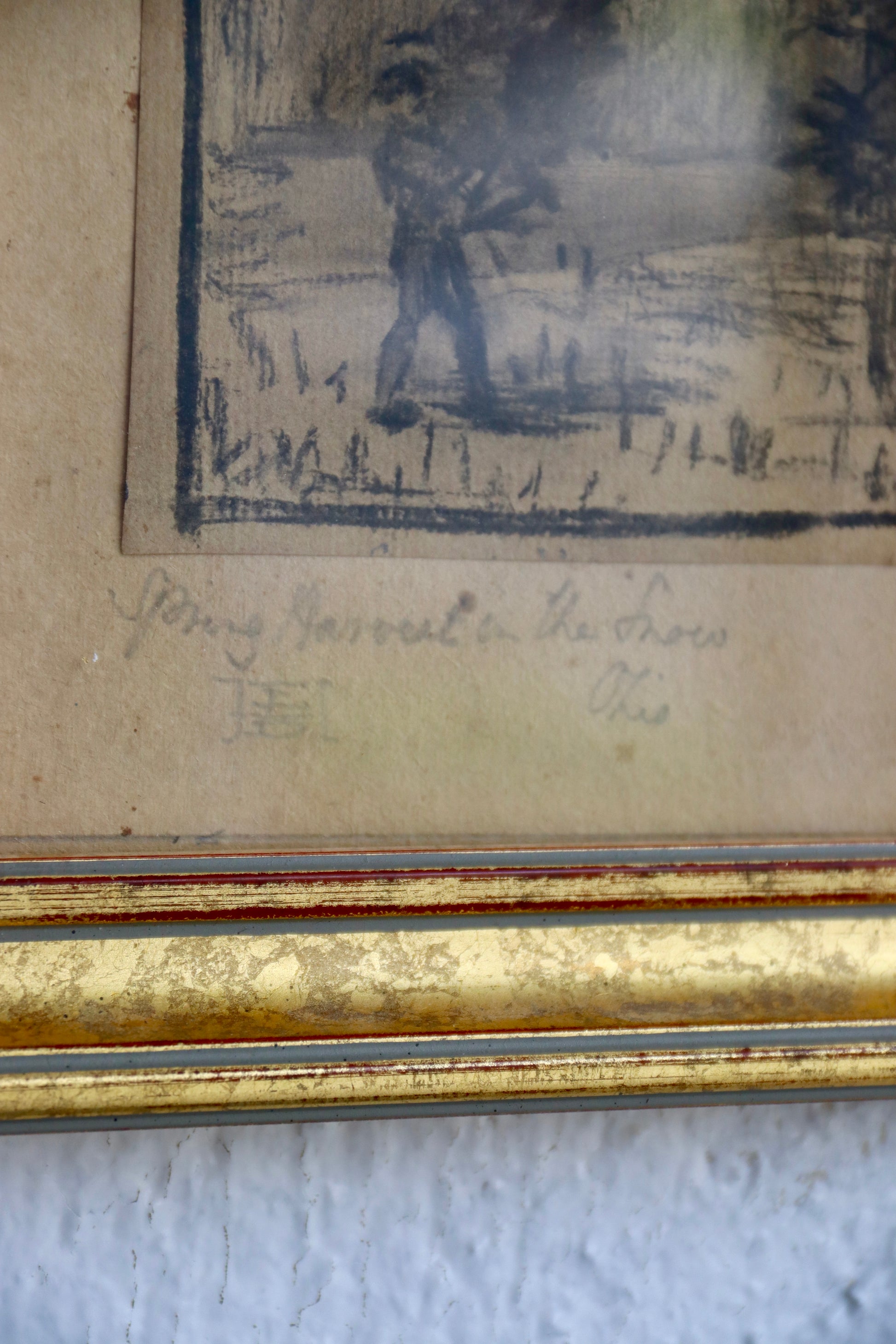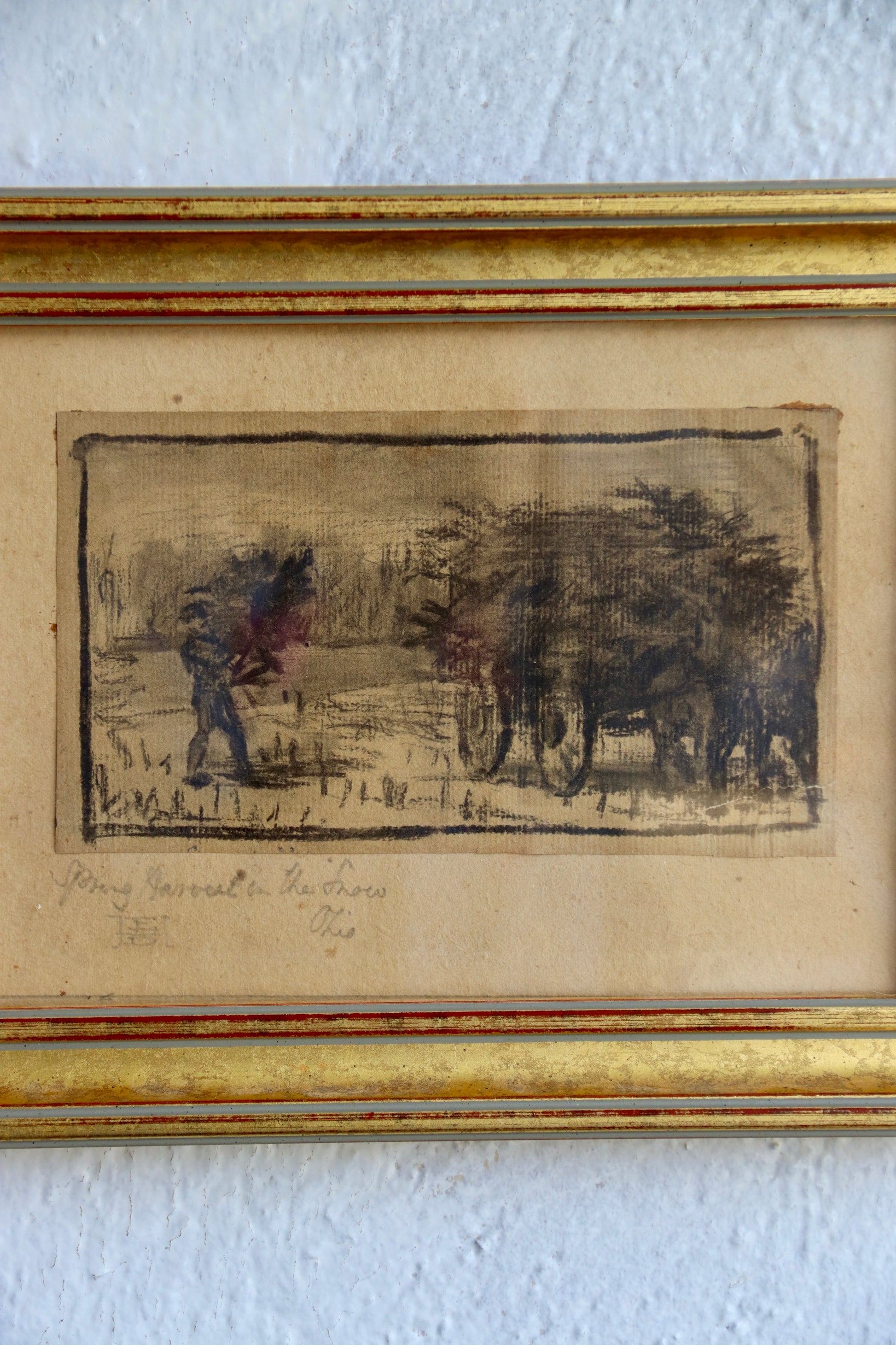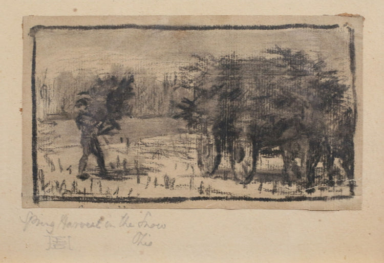 Ellen Day Hale (American, 1855-1940), charcoal drawing, Spring Harvest in the Snow Ohio, signed with artist's EDH monogram and titled on the mount, 5 1/4" x 7 5/8" (with frame 7 3/8" x 9 3/4")