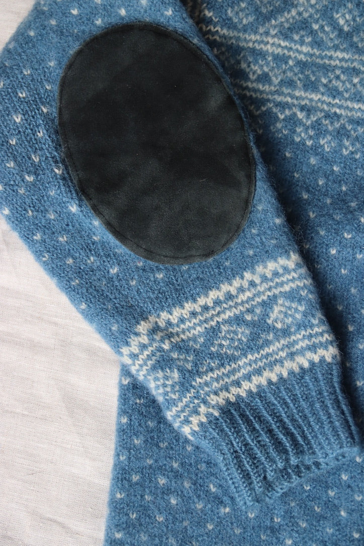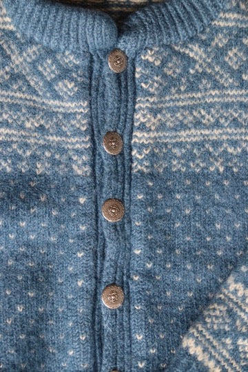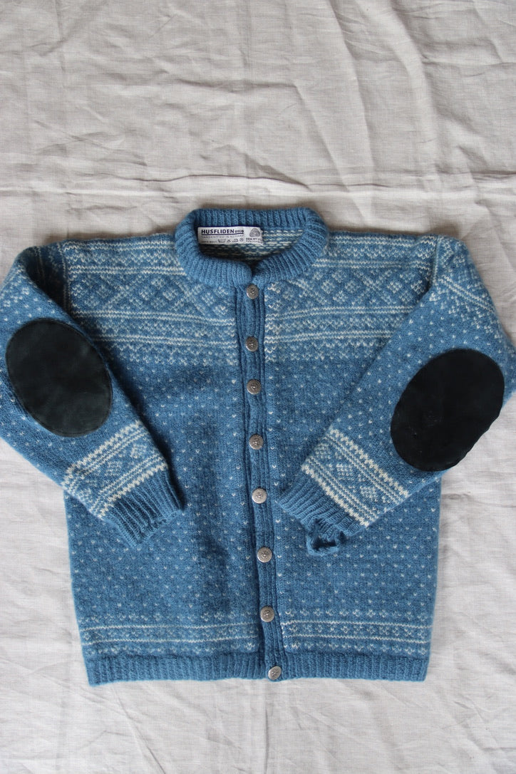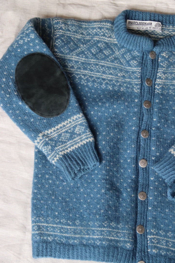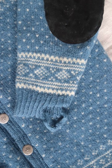 Vintage Blue Norwegian Wool Button Up Sweater with Leather Elbow Patches