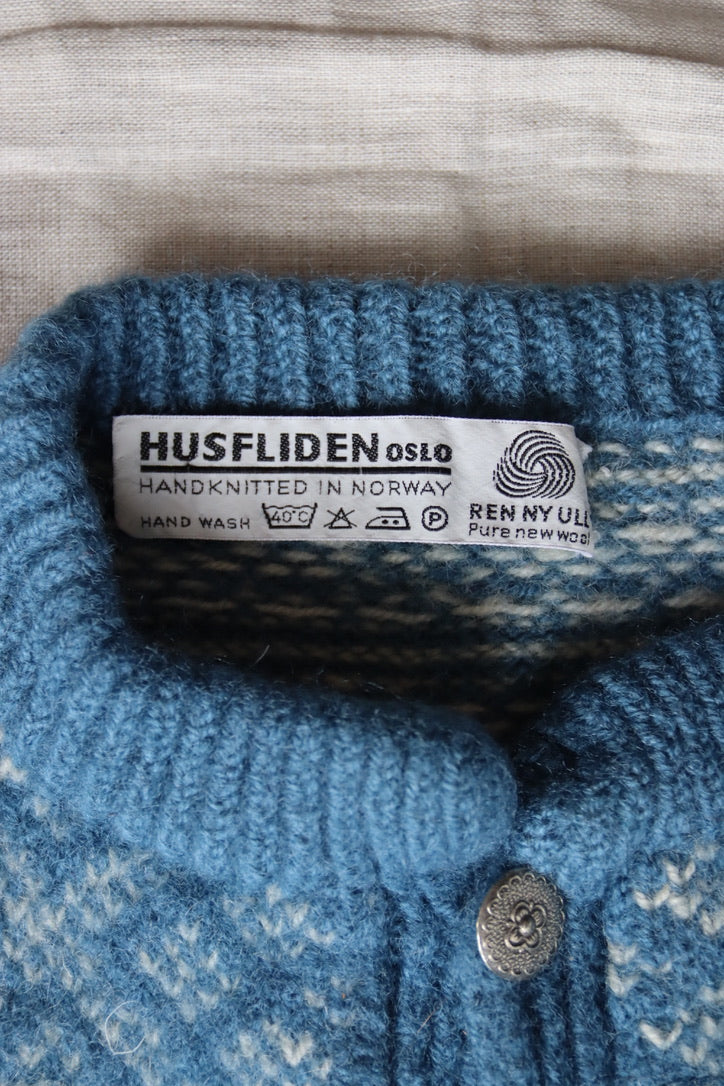 Vintage wool HUSFLIDEN OSLO blue sweater with buttons. Handmade in Norway. Has a ripped edge on left sleeve.